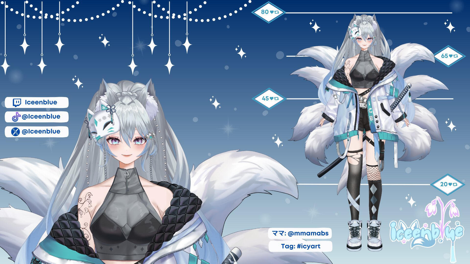 Hi!! My name is Iceenblue or you can call me Ice or blue for short. I'm a Snow Spirit Kitsune VTuber [half yuki-onna/half fox] that loves streaming gacha games, fps games like Valorant, and co-working with my community!I started streaming in 2020 for my friends to watch but went on haitus to focus on myself.I came back into streaming as a VTuber in 2023 as well as starting my own org, Kazoku, with my friend Velreal to help creators grow their content (both streaming and non-streaming).I hope that my streams can bring you a smile and laughter. I absolutly wouldn't be where I am without my community and friends supporting me~